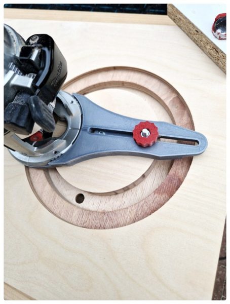 Die Schallwände fräste ich dann im Garten, um nicht den ganzen Staub im Keller zu verteilen. Ich hatte mir fürs erste Projekt schon mal einen Fräszirkel zugelegt, der ganz gut funktionierte. Ein bisschen Bammel hatte ich schon, als ich anfing, den ersten Kreis zu schneiden. Die Fräse geht wirklich gnadenlos zu Werk. Wenn sich die Arretierung des Zirkels lockert, wars das mit der Schallwand, dachte ich. Aber zum Glück lief alles so wie gewünscht. Das hat dann richtig Spaß gemacht und als auch die Chassis dann noch reinpassten – ich war richtig stolz auf mich, dass das so wunderbar klappte. Das war und sah richtig perfekt aus!