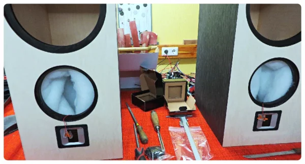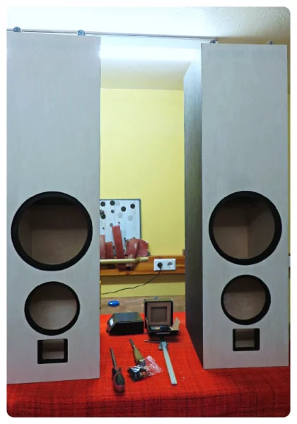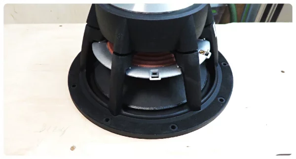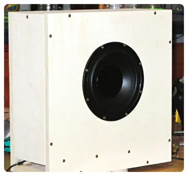 Das erste Mal in Berührung mit Lautsprecher selbst bauen kam ich vor ca. 5 Jahren über einen Arbeitskollegen. Der wollte für sein Auto ein bisschen mehr und hatte sich eine kleine Bassbox überlegt. Er fragte mich, ob ich ihm da nicht beim Bau etwas helfen könnte. Meine Werkstatt bestand zu dem Zeitpunkt noch aus einem Basteltisch und rudimentären Handwerkszeug. Zuschnitt durfte also der örtliche Baumarkt erledigen und es wurde – nach meiner heutigen Sicht – mal eben zusammengesetzt. Das klang auch gar nicht so völlig verkehrt. Zufällig habe ich davon sogar noch ein Bild gefunden.