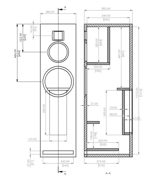 Ich hatte immer wieder Angst um den Volumenverlust von knapp 3 Liter der Modulkästen und habe mich und damit teils bestimmt auch Udo in den Wahnsinn getrieben. Nach einigen Rechnungen und Vergleichen mit Udos FreeCAD Modellen konnte er mich letztlich doch überzeugen, dem nicht zu viel Bedeutung zuzumessen. Seine Antworten waren grob zusammengefasst recht eindeutig „Junge, weniger denken, mehr bauen“ Für mich als Kopfmensch und Datenvergleicher nicht ganz einfach. Aber der Erfahrung beuge ich mich mit etwas Zureden dann eben doch. So ergab sich dann die Konstruktion ohne große Abweichung zu seinem Aufbau. Die Außenmaße änderten sich aufgrund der anders geplanten Materialstärke. Außenwände in 21mm und die Innereien in 18mm. Die Maße in Klammern sind die Originalmaße aus Udos Vorschlag.