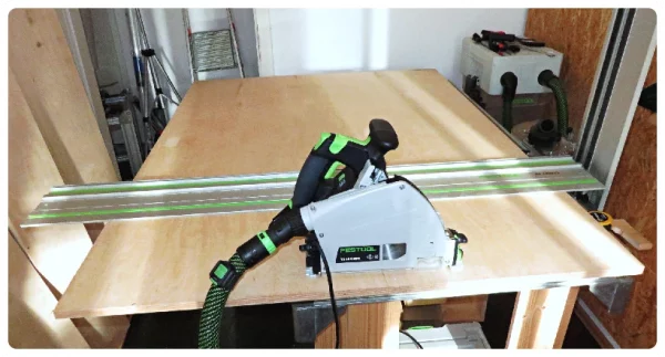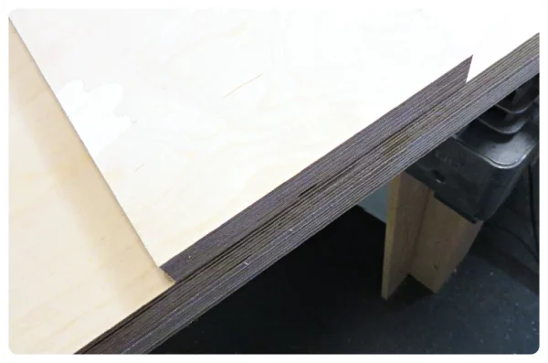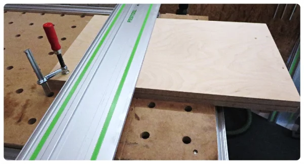 Wie schon gesagt, bekommt man so schon wirklich gute Genauigkeit hin. Abweichungen sind gerade so spürbar, wenn man die Teile übereinanderlegt. Mit einem Maßband sind sie praktisch nicht messbar. Ein Parallelanschlag für die Schiene oder eine Tischsäge sind hier auf jeden Fall im Vorteil, wenn es um die wiederholgenauen Schnitte geht. Das sollte dann auch an den Seiten ersichtlich werden. Um diese möglichst gleich zu halten, war die Idee, sie im Paket zu sägen. Also beide Platten aufeinandergelegt, mit Zwinge auf dem Tisch gehalten und die Schiene mit Zwingen gut angezogen. Mit den Fingern ließ sich die eine Seite wunderbar aufeinander ausrichten. Nach dem Schnitt auch wunderbar kein Versatz.
