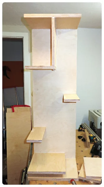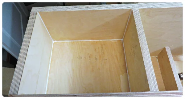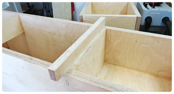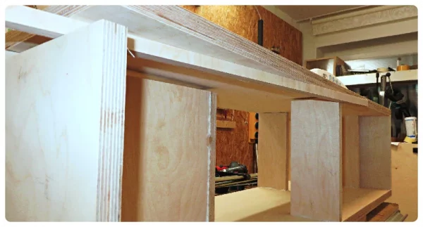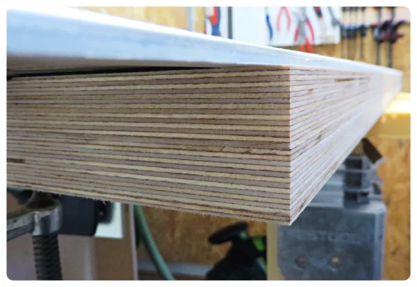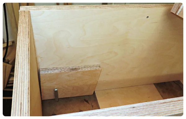 Nachdem die Konstruktion geklärt war, konnte der Bau beginnen. Zuerst ging es daran, das bestehende Holzlager zu sichten. Ich wusste noch, dass ich auf jeden Fall genug Platten an 18 mm und von meinem Bettumbau noch einige Streifen 21 mm Birkenmultiplex hatte. Also erstmal kontrollieren, für welche Teile die 21er Streifen noch passen würden. Es ergab sich, dass die Streifen gut für die Fronten, Seiten, Deckel und Boden reichen würden. Für die Rückwände würde es also 18 mm werden.