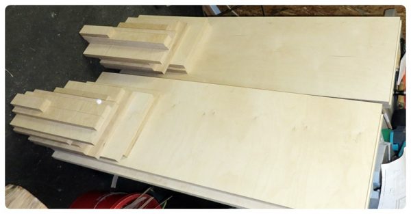 Vorteil der Geschichte war, dass die nun versägten Seitenteile als Rückwände herhalten konnten und somit der gesamte Korpus aus 21er würde. Hier dann einmal alle Teile sortiert und markiert aufgestellt.