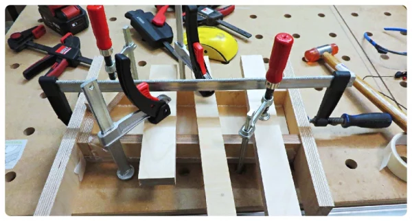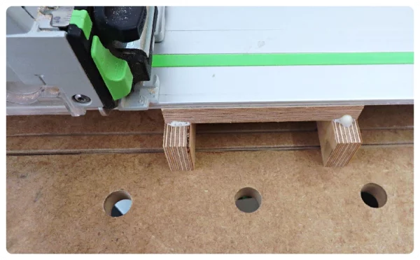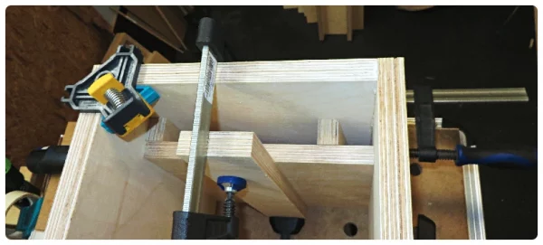 Vorteil dieser Konstruktion ist auch, dass man wunderbar Mitten abgreifen kann. Ein Extrasteg für die Höhe. Die Stöße an den Platten für die seitliche Ausrichtung. Wie man sieht, bieten die Verbindungsplatten auch gleich die Möglichkeit Zwingen anzusetzen.