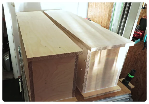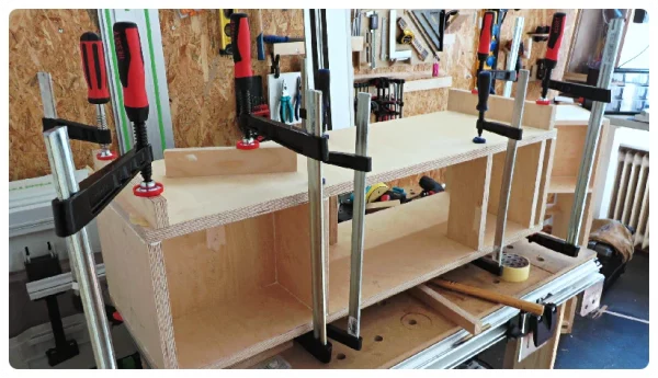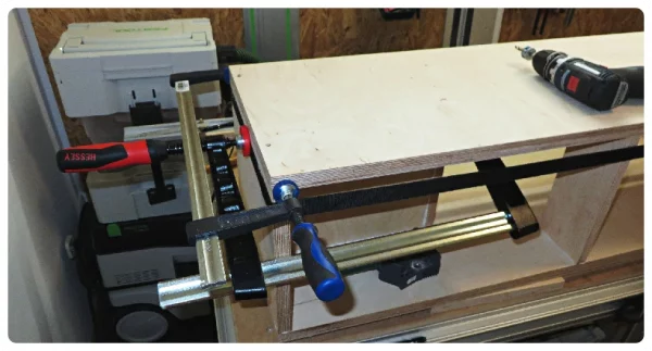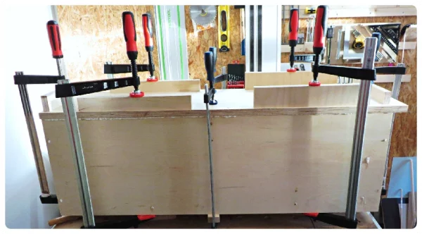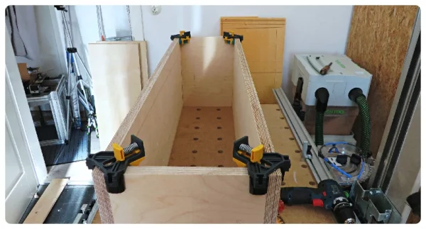 Und dann wieder alles zusammen zwingen. Da die Rückwand hier schon Höhe extra brachte, konnten die Druckleisten teils nicht mehr so hoch ausfallen. Da kommen die 500er Zwingen schon ans Limit. So liegen dann nach der Wiederholung die beiden großen Kisten auf dem Tisch. Die Überstände habe ich erstmal gelassen. So konnte es mir egal sein, ob beim weiteren Handling für die Ausschnitte noch Schäden an die Kanten kommen.