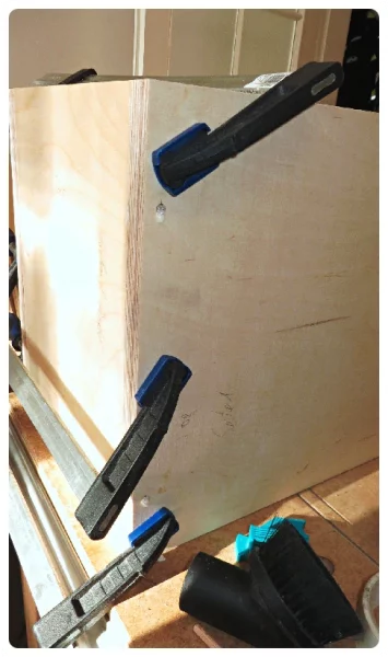 Mit den hier gewonnenen Erkenntnissen gings an den Korpus. Die Teile erstmal trocken ausgerichtet und miteinander fixiert. Die kleinen Eckenspanner haben hierbei schon erstaunlich gut geholfen. Zum Bohren habe ich die Teile nochmal zusätzlich mit Zwingen gegeneinander gespannt. Im trockenen Zustand Löcher für 6er Dübel durch die Seite gebohrt, Leimraupe aufgetragen und verzwungen. Das stumpf Durchbohren habe ich mir hier erlaubt, weil es einfach schnell geht und sicher fluchtende Bohrungen ergibt. Die Dübel werden durch das Furnier später ohnehin verdeckt. Lässt man die Außenseiten roh, sollte man sich da natürlich etwas mehr Mühe geben. Da ich nur drei ausreichend lange Zwingen hatte, mussten Deckel, Boden und Reflexkanalbrett nacheinander geleimt werden. Den Deckel habe ich erstmal nur gegen eine Seite geleimt. Die zweite Seite sollte, wenn die Abtrennungen für die Mitteltöner-Kammer auch fest wären, geleimt werden. Soweit zumindest der Plan.