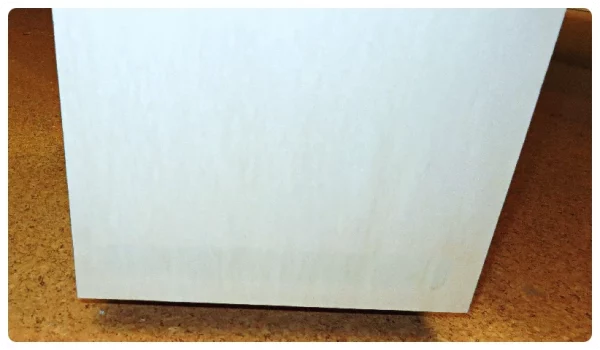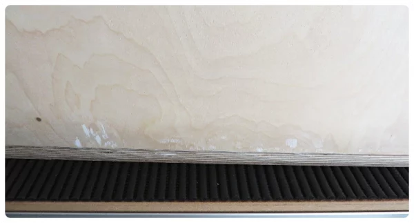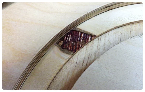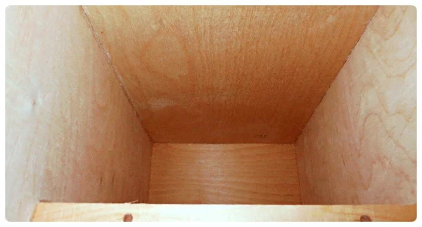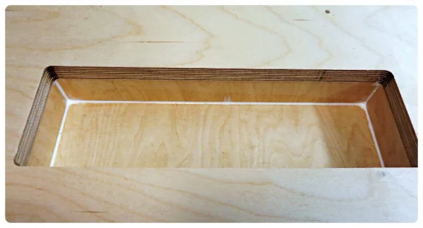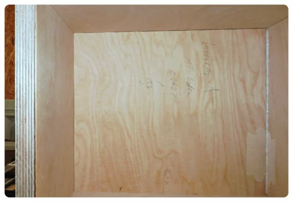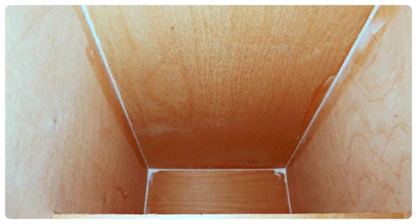 Interessant ist auch, dass sich die Schichtung vom Multiplex durch das Furnier abzeichnet, wenn man genau schaut. Ob hier der Kantendruck doch zu groß war oder man das mit Spachteln hätte verhindern können, kann ich nicht sagen. Live muss man aber schon danach suchen, um es wieder zu sehen. Am Deckel zeichnet sich ganz fein eine helle Linie vom Leim ab. Aber auch das ist nur aus direkt Nähe sichtbar. Hier könnte vielleicht das Aufbringen mit einem Leimroller helfen, dass man weniger Leim als mit dem Zahnspachtel hat.