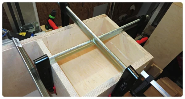 Die zweite Seite bleibt erstmal noch unverleimt. Die Aussteifungen müssen ja auch noch rein. Die Versteifungen wurden mit den Fingern ausgerichtet, während eine Zwinge immer etwas Spannung hält, dass sie nicht von alleine verrutschen. Dann konnte die zweite Seite verleimt werden. Hier zeigte sich dann beim Auflegen, dass da etwas Verzug drin war. War sie am Boden ja schon vorher bündig ausgerichtet verleimt, wollte der Deckel irgendwie überstehen. Mit Spanngurt und Zwingen also alles mal etwas zurechtgerückt für die Dübelbohrungen. Jetzt kam der schwierige Teil. Irgendwie musste ich jetzt Spalt zwischen der Seite und den Teilen bekommen, um da Leim zugeben zu können. Ein Stab diente als Spreizer.