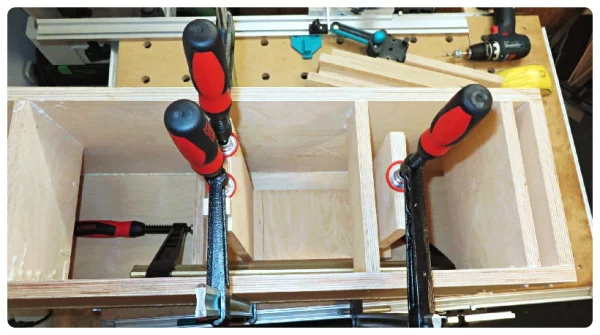 Auch wenn es funktionell wohl relativ egal ist, habe ich die ganzen Leimüberstände abgekratzt. Ein scharfes, kleines Stecheisen und das ausgebaute Hobelmesser meines Handhobels sind hierfür genial. Erstmal nur auf der Rückseite der Mitteltonkammer, wo ich mit aufgeleimter Rückwand eben nicht mehr hinkomme. Dann die Rückwand aufgeleimt. Die habe ich einfach ringsum mit Überstand gelassen. Da kümmert sich dann der Bündigfräser am Ende drum. Hier brauchte ich dann das aufgerüstete Zwingensortiment auf jeden Fall. Auf die Rückwand kam dann die Box fürs Aktivmodul. Hier musste dann mal wieder etwas getrickst werden, um anpressen zu können. Die zwei Zwingen oben sind nur, weil sich das Andruckbrett sonst seitlich verschoben hatte.