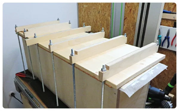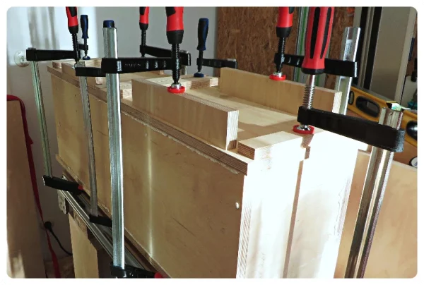 Bei der zweiten Box wusste ich es dann ja schon etwas besser. So ging es hier ganz gut von der Hand. Es kamen auch nochmal drei 500er Zwingen in den Werkstattpark. Damit konnten dann mehrere Teile auch bequem gleichzeitig geleimt werden. Erstmal alles auf eine Seite geleimt sieht auch irgendwie spannend aus.