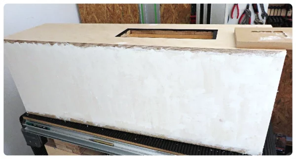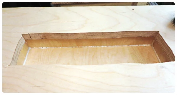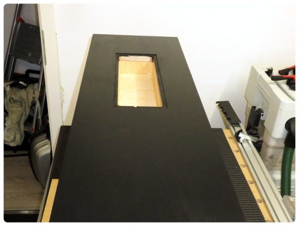 Nun geht’s wieder ans Öffnen. Die Ausschnitte müssen rein. Angefangen habe ich mit dem Freimachen der Modulbox. Erstmal nur ein größeres Loch gesetzt und mit dem Bündigfräser soweit gefräst, dass ich genug sehen kann, um das Gröbste dann mit der Stichsäge raus zu holen. Hier aufpassen, dass das Blatt nicht zu lang ist und anstößt. Dann mit dem Bündigfräser sauber auf Kontur gebracht. Leim aus den Ecken und nochmal nachgedichtet. Über Sinn brauchen wir hier wohl kaum diskutieren.