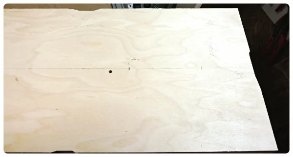 Alle Außenteile zunächst grob aussägen. Mit den 150x110cm Vollplatten wird es in der Werkstatt schon etwas eng. Aber man kommt noch zurecht. Einer der 21mm Reststreifen hatte noch ein Schraubenloch. Hier habe ich den Rohschnitt noch so großzügig lassen können, dass ich das später mit einem der aufgesetzten Teile abdecken könnte.