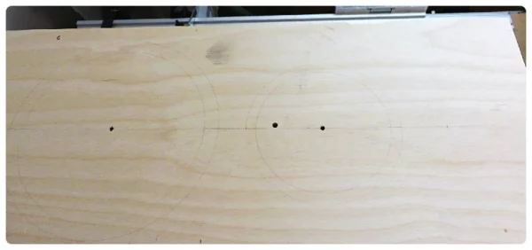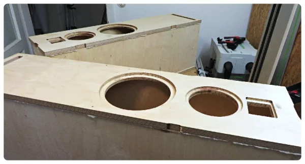Der Ausschnitt für den Reflexkanal kam auf gleiche Weise. Für die Chassisausschnitte wurden die Mittelpunkte erstmal angezeichnet. Um von den Kanten messen zu können, wurde an ein paar Stellen schonmal bündig gefräst. Das Loch auf dem Bild ist nicht verbohrt, sondern war einfach schonmal, dass ich zum Trocknen die Kammer zumindest etwas öffne. Zum Abschätzen und Einstellen des Fräszirkels die Durchmesser mit dem Zirkel aufgezeichnet.