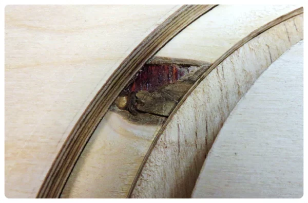 Die Gewindestangen waren leider so knapp beieinander, dass auf der Seite liegend die Box zwar gerade so dazwischen passte, aber nicht mit viel Luft. Und so habe ich mir trotz Klebebandschutzschicht um die Gewindestange ein kleines Stück ausgerissen. Das Eck habe ich dann mit einem kleinen Flicken vorsichtig wieder aufgefüllt. Hier helfen das helle Holz und die wilde Maserung, dass das später kaum noch sichtbar ist.