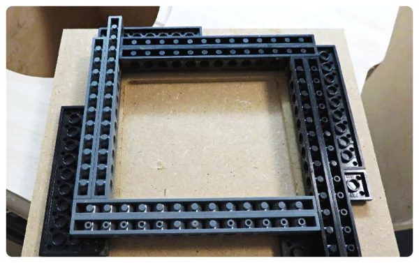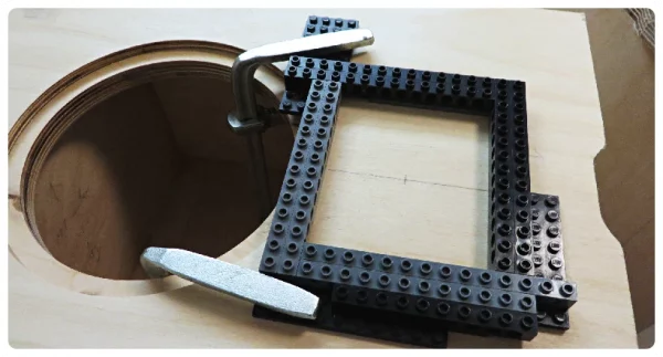 Für den Hochtöner war ich mir erst unschlüssig, wie ich die Schablone für den Kopierring basteln soll. Dann bin ich wieder über ein Video von Heiko Rech gestolpert. Schablonen aus Legosteinen. Da musste ich doch mal schauen, ob mein Fundus etwas Passendes hergibt. So ganz die perfekte Auswahl war nicht da, aber es sollte reichen. Und tatsächlich ergibt sich so eine sehr gut passende Größe. Erstmal eine Probefräsung, ob die Maße auch hinkommen. Abdeckung sagt: „Passt gut.“