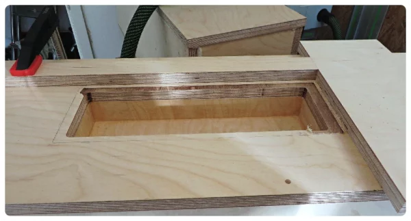 Und einmal alle Ausschnitte fertig. Wo ich die Kopierringe schon angeschafft hatte, auch gleich genutzt, um einfach mit Leisten als Anschlag einen Absatz für die Aktivmodule zu fräsen.