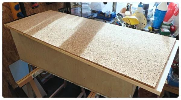 Mittlerweile war schon Weihnachtsurlaub bei der Familie angesagt. So wurden die letzten Schritte dann in Wohnzimmer und Werkstatt meines Vaters verlegt. Der Deckel wurde mit dem Bügeleisen furniert. Eine Presse über die Länge wäre auch interessant geworden und nicht mal eben greifbar. Beide Seiten mit dem Zahnspachtel gleichmäßig mit Weißleim eingestrichen. Hier habe ich geschaut, dass ich nicht zu viel Leim habe. Und dann eben mit dem Bügeleisen auf voller Leistung und mit etwas Druck aufgebügelt. Dafür, dass es mein erstes Mal war, ging das wirklich gut von der Hand. Nach der Erfahrung würde ich sagen, das kann man durchaus auch für die große Fläche machen. Die Pressmethode finde ich da aber dann doch etwas entspannter, wenn man die Möglichkeit hat. Die Überstände habe ich dann mit einer Schere vorgeschnitten und mit dem scharfen Hobeleisen auf die letzten Millimeter gebracht. Das letzte Stück dann wie üblich von Hand mit dem Schleifblock. Für die nächsten Schritte sind die Boxen dann in die Werkstatt gezogen.
