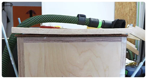 Für die ersten Erfahrungen mit dem PU-Leim habe ich mit den Kästen für die Aktivmodule angefangen. Dabei auch festgestellt, dass durch die zähere Konsistenz die Teile stark zum Verschwimmen neigen. Für die weiteren Teile wurde daraufhin beschlossen, mit Dübeln für Fixierung zu sorgen. Die Stirnseiten habe ich nachträglich zugesägt. So ergibt sich sicher eine einheitliche Auflagefläche. Da kam mir die Schnitttiefe meine Tauchsäge mal gut zur Hilfe.