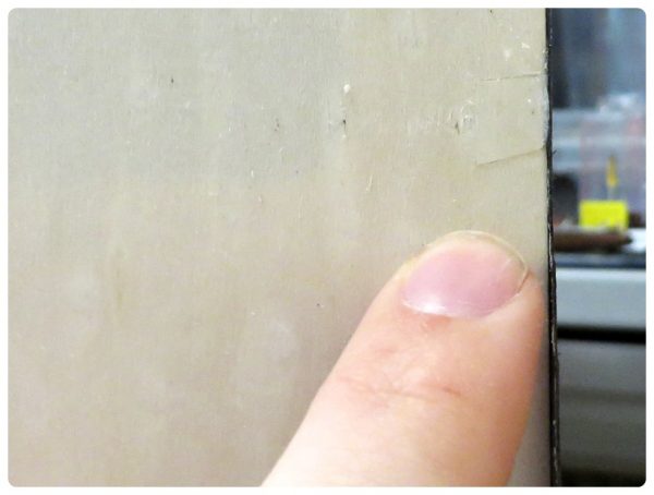 Irgendwie schien mir die Qualität der neuen Seitenteile nicht so fein wie meine alten Platten. Zumindest hatte ich in der Oberfläche überall kleine Ausrisse. Und an den Kanten auch. Da ich nicht abschätzen konnte, ob sich das später im Furnier zeigen würde, habe ich das ausgespachtelt. Die Dübellöcher bei Bedarf auch gleich mit gespachtelt. Erstmal nur die Kantenausrisse. Wo ich dann aber dabei war, habe ich in einem Anflug von Wahnsinn die ganze Fläche gespachtelt und dann eben auch wieder geschliffen. Man sieht dann schon, dass da einige Stellen gut gefüllt wurden.