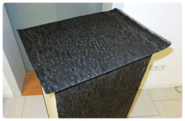Da in den nächsten Schritten die Kanten und Flächen fürs Furnieren empfindlicher werden, habe ich den Tisch etwas abgedeckt. Ich hatte noch eine ungenutzte Badezimmermatte. Die ist so leicht geschäumt und sollte einen gewissen Schutz bieten. Es hat sich allerdings auch gezeigt, dass die unter dem Druck beim Furnieren dazu neigt, an Lack zu haften. Lässt sich aber recht problemlos wieder abrubbeln.
