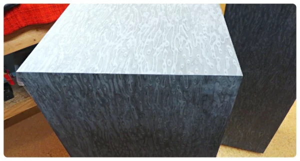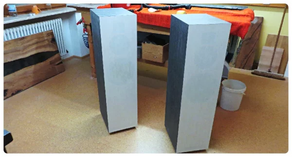 Ich hatte etwas überlegt, was ich denn nehmen könnte, und etwas mit meinem Fundus experimentiert. Leinöl gibt dem hellen Furnier doch etwas viel Gelbstich. Mein Holzsiegel-Lack gibt etwas weniger Gelbstich, aber so richtig zufriedenstellen fand ich Hochglanz-Lackoptik dann doch nicht. Zum Glück haben wir im Ort einen Farbfachmarkt. Da habe ich dann einfach mal nach einer möglichst wenig anfeuernden, vergilbungsfreien Beschichtung gefragt. Empfohlen wurde mir dann eine Lasur, die für helle Hölzer gedacht ist, um gerade Nachdunkeln durch UV zu vermeiden (Adler UV 100). Ein erster Test ergab, dass die Farbe des Holzes dadurch tatsächlich nicht sichtbar beeinflusst wird. So dann das Resultat. Auf dem vorderen Deckel erkennt man noch etwas feuchten Glanz. Der Verschwindet dann beim Trocknen komplett und man erhält praktisch die frisch geschliffene Optik wieder. Auf der hinteren Box gut zu sehen. Als Resultat bleibt die natürliche Optik vollständig erhalten. Das Schwarz bleibt so etwas anthrazit-farben. Da würde ein Anfeuern durchaus auch gut wirken. Aber im Zusammenspiel bin ich sehr zufrieden.
