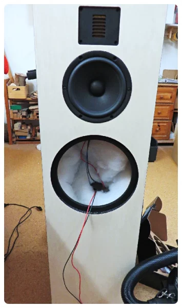 Dann einmal Hochtöner einsetzten. Durch die weiterhin knappe Passung brauchten die sanften Druck und saßen auch ohne Schrauben schon verliersicher. Für die Dämmung habe ich vom großen Bogen, den Udo mitgegeben hatte, einen Streifen in etwa der Höhe der Mitteltonkammer abgeschnitten. Der halbiert gab dann für jede Kammer einen Streifen, den ich gefaltet und einfach eingesetzt habe. Die vier entstandenen Lagen ergab dann in der Mitte eine Tasche für den Mitteltöner. Der übrig gebliebene Streifen Dämmung hatte ziemlich genau die Höhe der Basskammer. Also den wieder halbiert, dass ich für jede Box die gleiche Menge hatte, und ebenfalls gefaltet. Durch die Versteifungen im Inneren lässt sich das nicht ganz so perfekt drapieren wie in der Mitteltonkammer. Aber es ragt nicht in den Kanal runter und schien mir die Beschreibung „gut gefüllt, aber nicht gestopft“ fürs erste gut zu erfüllen. Auch hier bekam der Bass ein „Nest“.