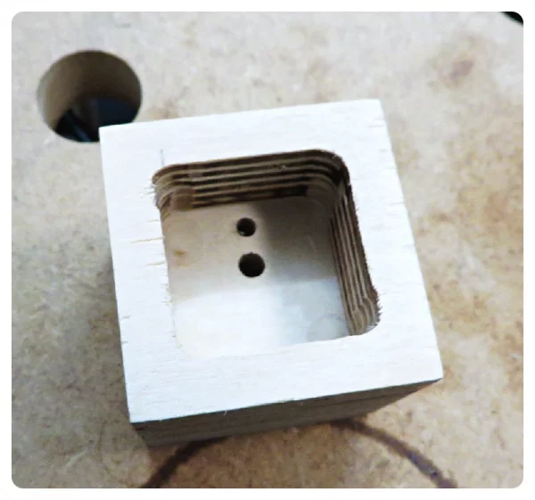 Beim Fräsen einen Ast im MPX gefunden. Erstmal etwas die Kanten sauber ziehen. Aus einem Rest einen Flicken schnitzen und einpassen. Man sieht es zwar später nicht, aber dicht wird auf so einem Absatz schwierig.