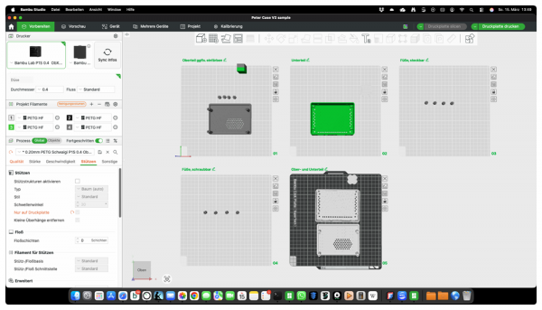Also PETG für die Schönen und damit wählte ich meinen Bambulab P1S aus, weil er im Gegensatz zu unseren anderen Printern der automatischen Materialzuführung, AMS, ein heizbares Gehäuse verpasst bekommen hat. PETG will tunlichst vor der Verarbeitung getrocknet werden oder in diesem Fall auch während des Druckes. Im Gegensatz zu PLA, welches zumindest nicht zwingend getrocknet werden muss. Außer im feuchten Umfeld. Nur zur Vollständigkeit.