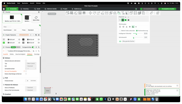 Aber auch das ist natürlich im Slicer kein Problem. Ich denke, in Slicern wie Orca oder Cura wird es ähnlich sein. In BambuStudio benutze ich das Maltool [N], wähle meine Farbe im AMS aus und mit „Ausfüllen“ und „Kantenerkennung“ geht das fast wie von selbst. Damit ist man schon druckbereit.