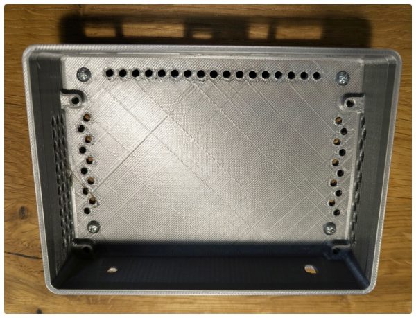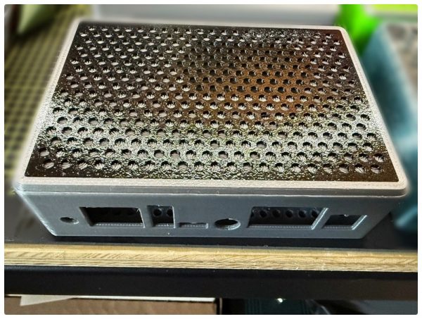 Geplant wurde das Case in PETG zu drucken, wegen der möglichen Abwärme. Michael hatte zwar genug Löcher für die Abluft geplant, aber wir wollten sichergehen. PLA verträgt nicht über 60° Temperatur und PETG geht immerhin bis 80° – sollte die Platine wärmer werden, haben wir sowieso ein Problem.