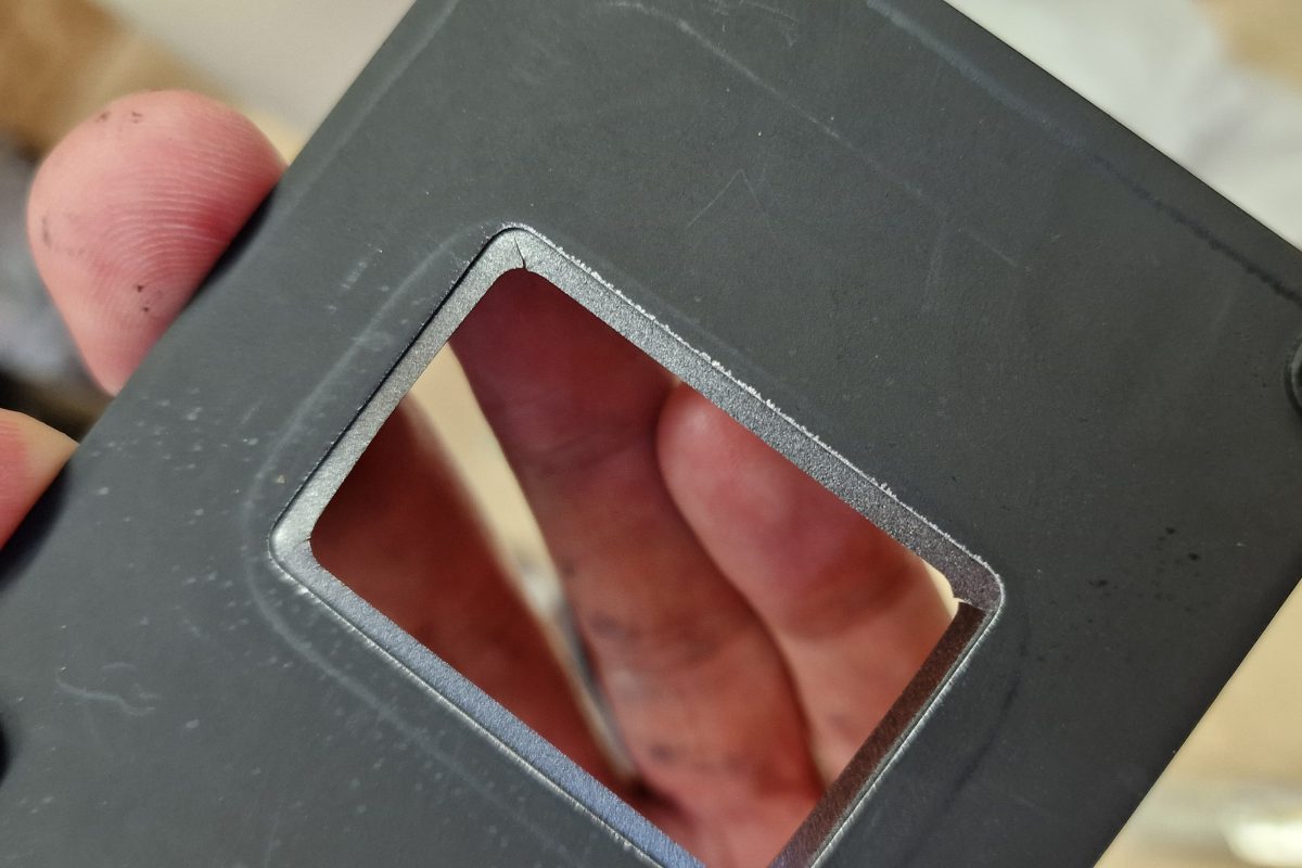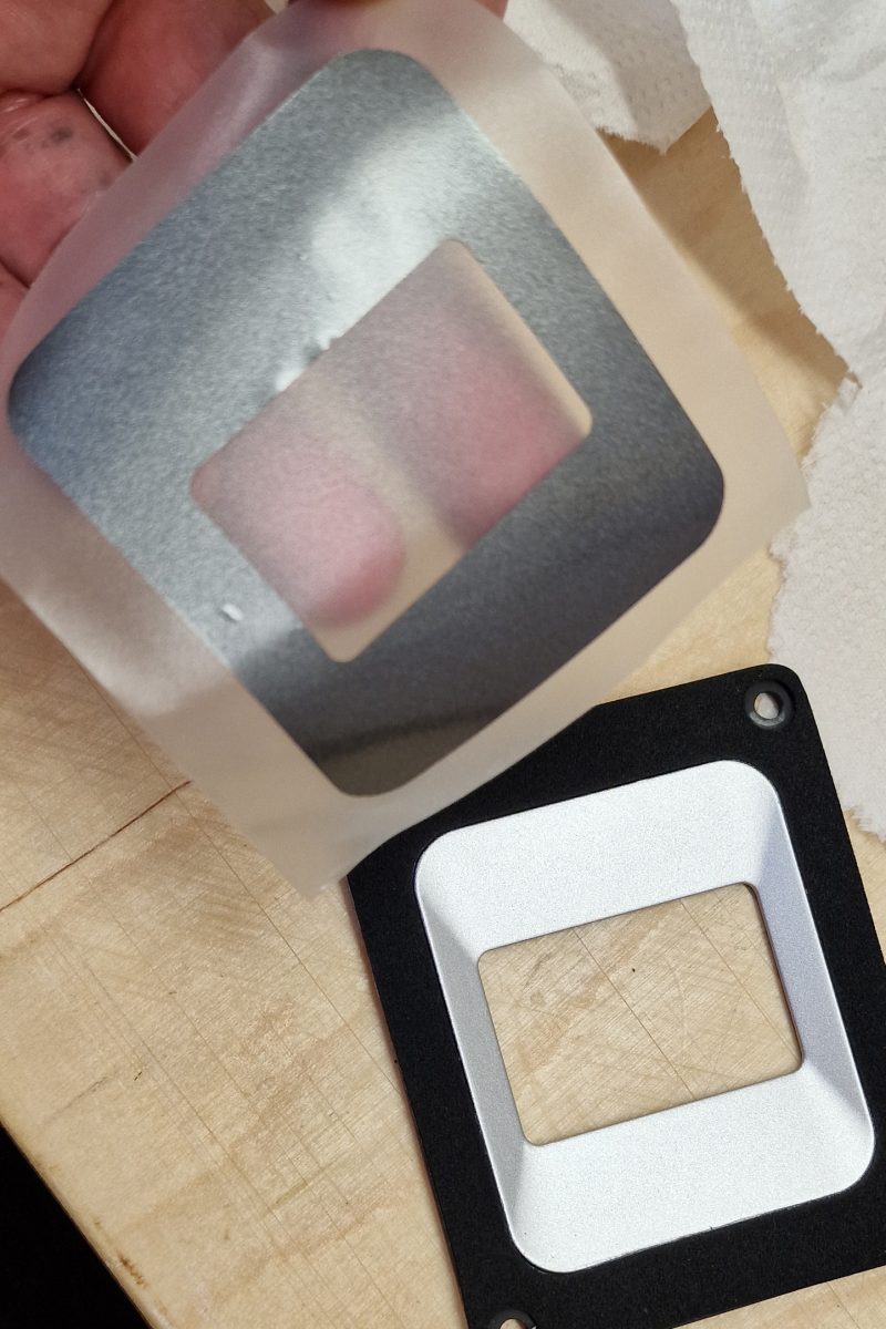 Die Aussenmaße der selbstklebenden Folie (Oracal 751C in Graphit Metallic) sind 66mm x 56mm und die Ecken haben 7mm Radius. Das Innenquadrat hat 20mm x 33mm und 2mm Radius. Wobei hier der Radius eigentlich völlig wurscht ist. Der Überstand der Folie wird sowieso nach hinten umgeschlagen. Ich hatte mehrere Versuche bis ich auf diese Maße gekommen bin. Damit hat man genug Klebefläche um die Folie sauber umzuschlagen. Die hält dann prima auf auf der Rückseite.