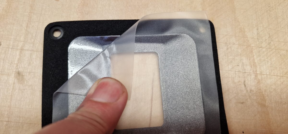 Also hab ich das dann so mit dem Plotter ausgeschnitten und den Innenteil rausgenommen. Dann Transferfolie auf die farbige Folie aufgeklebt und die eigentliche Selbstklebefolie damit von ihrer Trägerfolie gelöst. Nun bin ich mit der transparenten Transferfolie auf der die farbige Selbstklebefolie klebt auf die abgeschraubte Blende des AMT gegangen und habe es mit Augenmaß darauf plaziert. Vorsichtig anrubbeln und von aussen an den Rändern beginnen und dann nach innen streichen um möglichst keine Blasen einzuschließen.