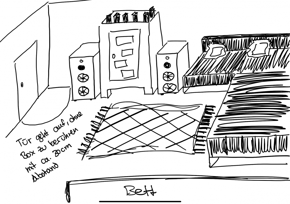 die Boxen momentan stehen links und rechts von meinem Schrank gegenüber von meinem Bett, auf dem ich normalerweise liege. Von Wand zu Box sind ca. 40 cm platz. neben der rechten Box kommt dann das Sofa, das ca. 60 cm hoch ist und auch direkt neben der Box steht.