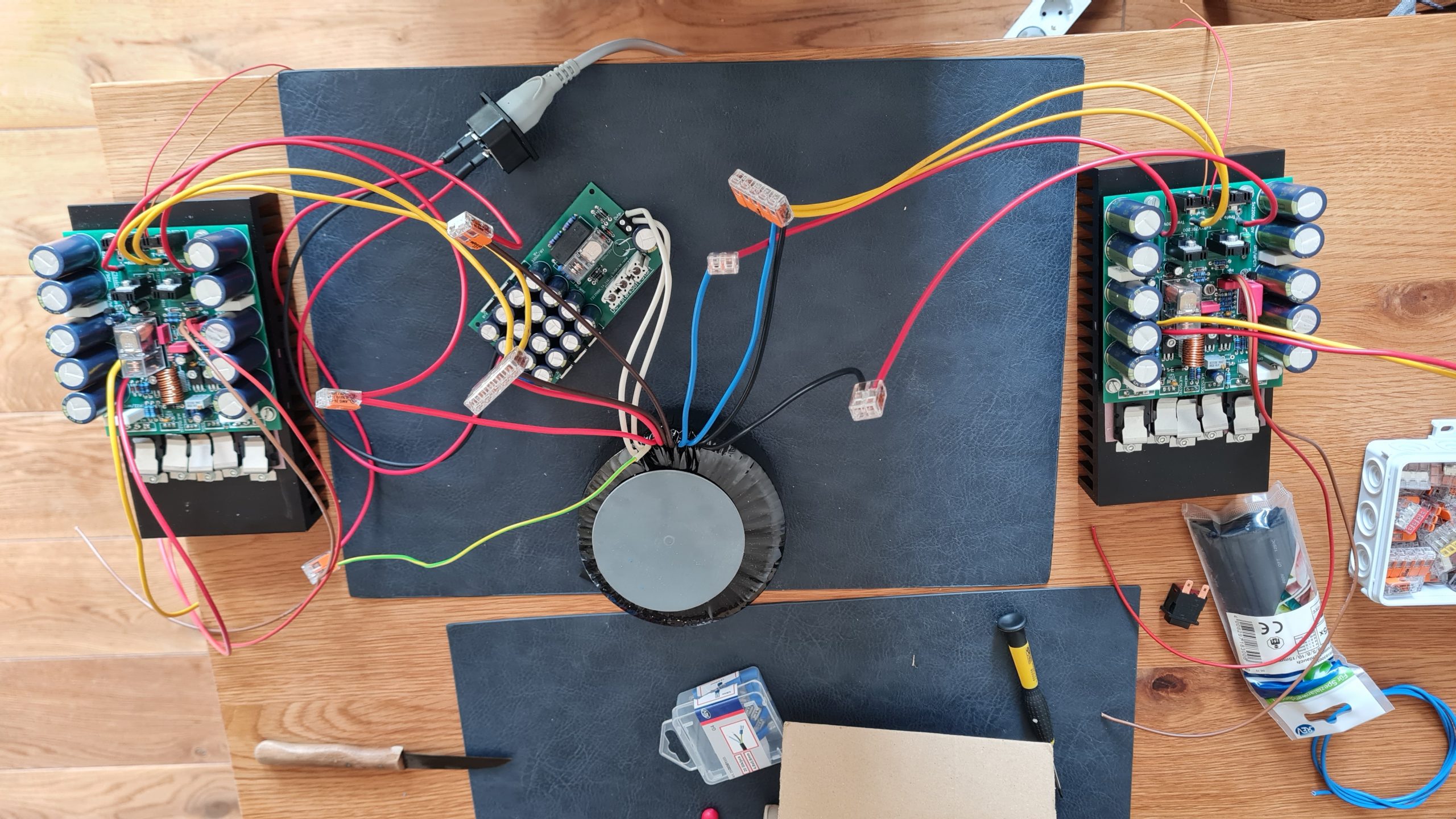 Erstmal das Ganze provisorisch verdrahtet um Ruhestrom und Offset ein zu stellen. Ob die extremen Offset Schwankungen bei einem Kanal am Multimeter oder an der Platine liegen muss ich noch prüfen. (1 Messung: Offset läßt sich zwischen 50-130 mV einstellen. 2Messung nach ca 1h, Offset zwischen -15 – +15mV)
