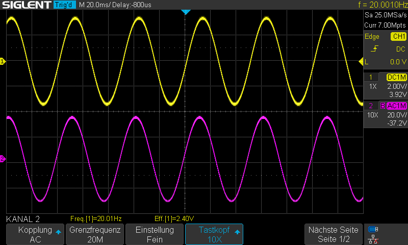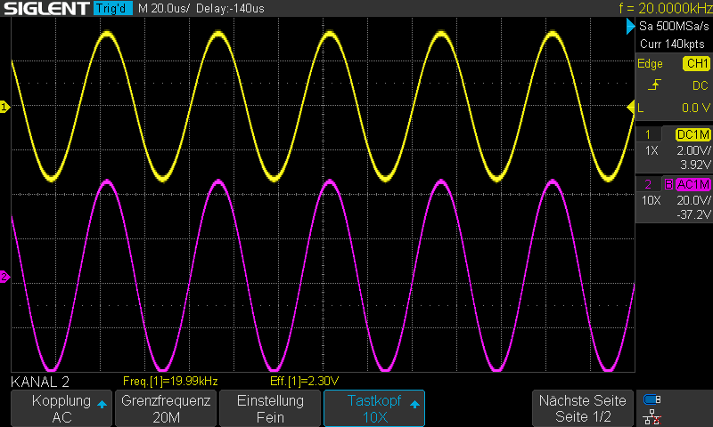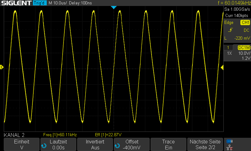 Noch einmal, das ist Sinus!Der Offset ließ sich bei beiden Modulen akkurat auf unter 1mV einstellen. Aber wie Andre geschrieben hat, nötig ist es eigentlich nicht, ohne die Offsetbaugruppe lag er zwischen 4 und 5 mV.