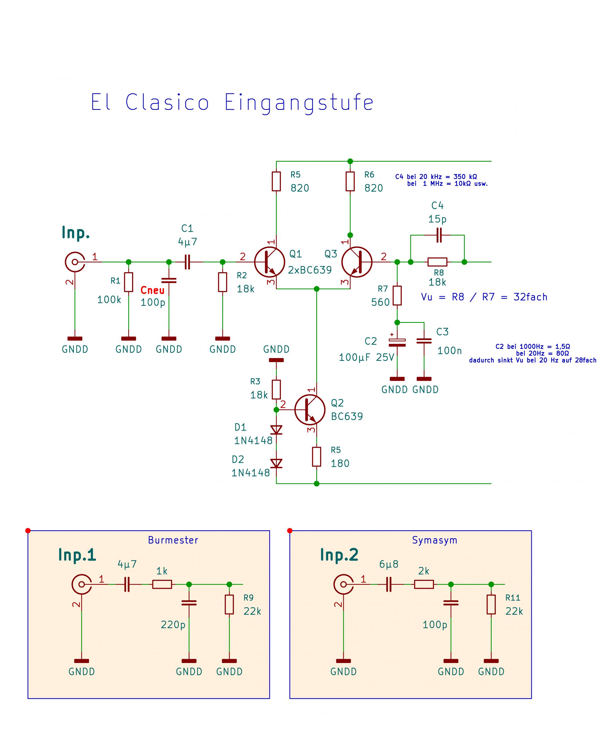 Zum zusätzlich -jetzt veränderten- El Clasico sind hier einmal zwei weitere Eingangsstufenbeschaltungen von bekannten Fabrikaten abgebildet:Ursache behoben. Der Signalgenerator an den Input angeschlossen, start bei 20Hz, schrittweise bis 100kHz.