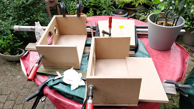 So wurde dann meinem naechsten Besuch zu Hause noch „Holz“ gekauft, im Baumarkt zugeschnitten und geleimt. War nicht perfekt, aber zum Glueck passgenau genug um die kleinen Ueberstaende gut runterschleifen zu koennen. Mein Vater war doch sehr skeptisch was den Selbstbau von Lautsprechern anging. Und ich war neugierig wie Bolle, also Weichen noch geloetet und alles rein in die rohren MDF Kisten.