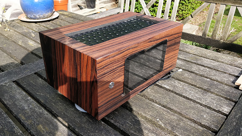 Dann kamen noch 2 Schichten Hartwachsoel drauf. Auf ohne vorherige Erfahrung damit und auf diverse Empfehlungen/Vorlieben hier in der Community hin. Klappt super und fuehlt sich echt gut an und schaut auch so aus! Allerdings war ich trotz Vorsicht nicht 100% akkurat beim Ausschneiden der Chassis Loecher aus dem Furnier. Also noch die Loecherraender geschwaerzt, damit es dann nicht ganz so auffaellt.