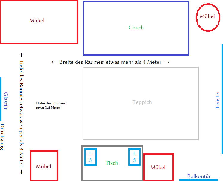 Derzeitig siehe Bild. Abstand zum Hörer vermutlich etwa 2,5 bis 3 Meter. Ein ideales Stereodreieck kommt eher nicht zustande, aber so ist das Leben. Immerhin ist scheinbar genug Textilzeugs und Pflanzenmaterial vorhanden, so dass der Hall quasi nicht da ist.– Welches Setup ist gewünscht? (Stereo / Heimkino X.2 / Heimkinooption gewünscht?)