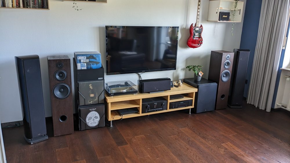 Zum Raum: Das Wohnzimmer ist ca. 21 qm groß, daran schließt sich offen der Koch-/Essbereich mit ca. 30 qm an. In Summe mit ca. 50qm einiges an Raum, währen der eigentliche Hörraum nicht mal die Hälfte ausmacht.