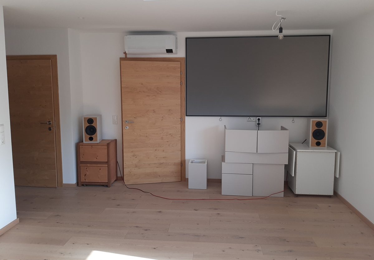 Standlautsprecher wandnah. Position 1 unter Leinwand, Position 2 links der Tür, siehe Foto und Skizze anbei.– Wie groß dürfen die Lautsprecher maximal werden?
