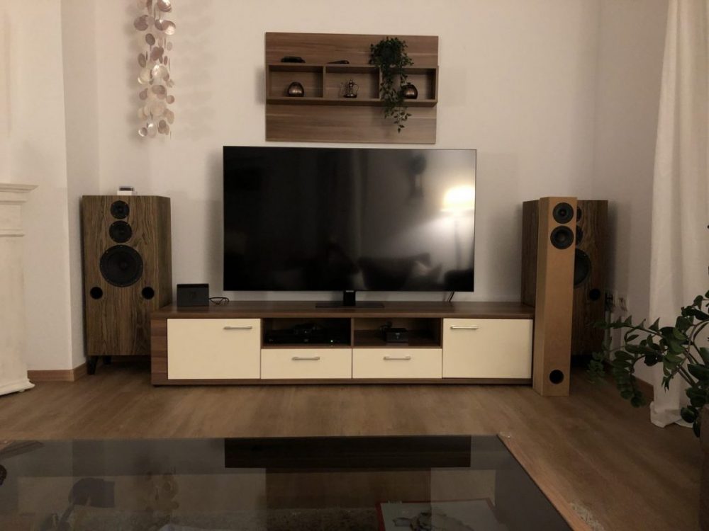 Also die Idee, dass man die Lautsprecher beim Musik hören rausrollt, finde ich gut. Angenommen die Position am jeweiligen Ende des Sideboards klingt gut, hätte ich Mitte Lautsprecherbox zur Seitenwand ca.40cm. Wenn Kompaktboxen auf dem Sideboard stehen ca. 50cm. Das ist mir aber zu unflexibel. Der Hörabstand zum Sofa wäre ca. 3,5m.