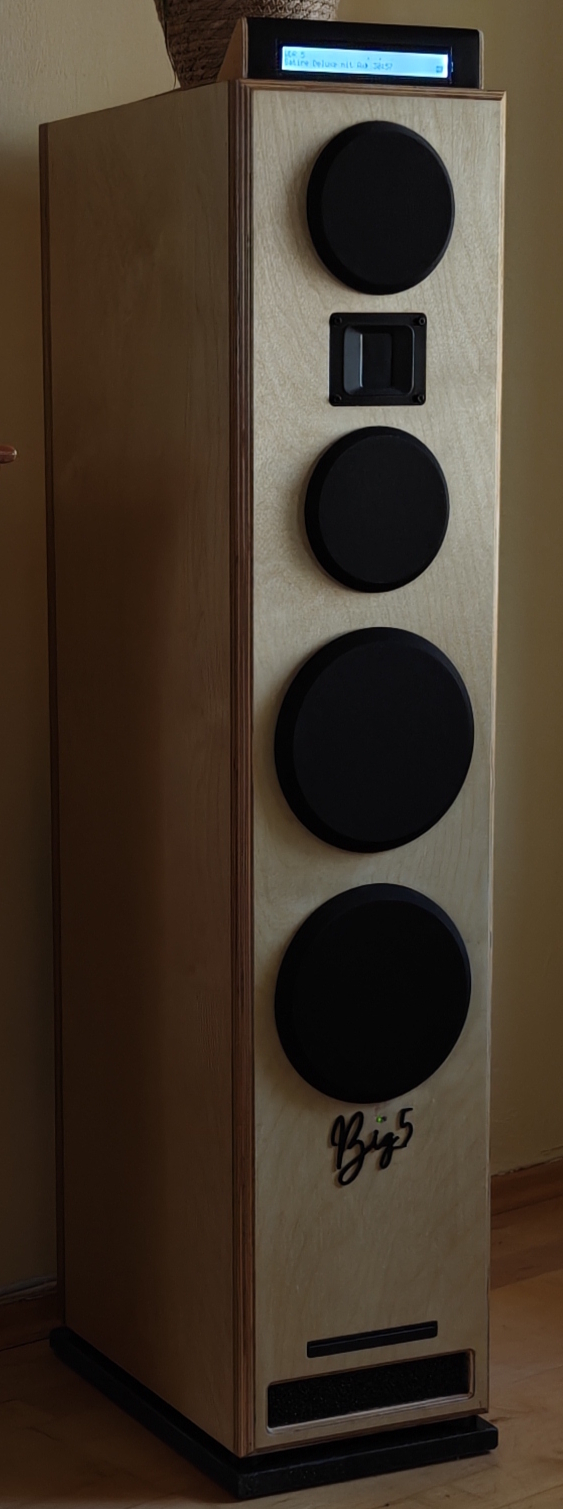 Da ich den Audioplayer auf Raspberry Pi Basis mit in die Lautsprecher integriert habe und außerdem noch ein 40×2 I2C Character-Display in der Bastelkiste lag , war es nicht besonders schwierig , dieses an den RPI zu klemmen . Es zeigt Künstler , Titel , Album , und Laufzeit des Titels an der grade läuft . Bei Internet-Radio zeigt es Künstler und Titel , bzw. den Sender an . Display und 5mm Birke für das Gehäuse kosten ca. 25 Euronen zusammen und sind fest mit der Box verschraubt . Ausser einer 4TB großen SSD ist für den Notfall auch ein CD-Laufwerk verbaut . Die Lautsprecher kommen somit ohne externe Geräte wie Vorverstärker und Mediaplayer aus . Spart Geld , Kabelchaos und Platz , wobei allerdings die zusätzlich verbaute Elektronik auch mit ca. 600.- €- 700,-€ zu Buche schlägt , wenn man nicht auf Klangqualität verzichten möchte .