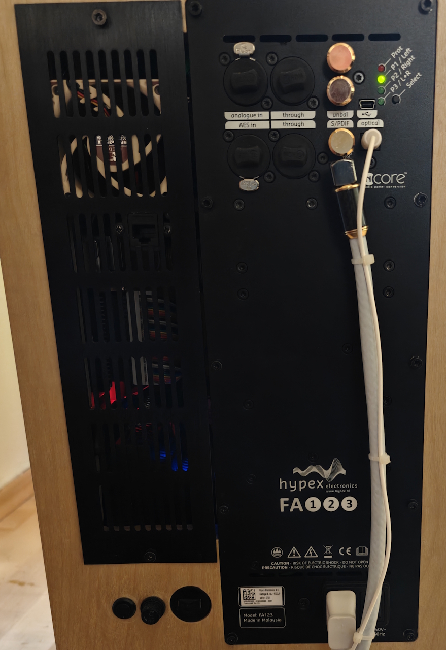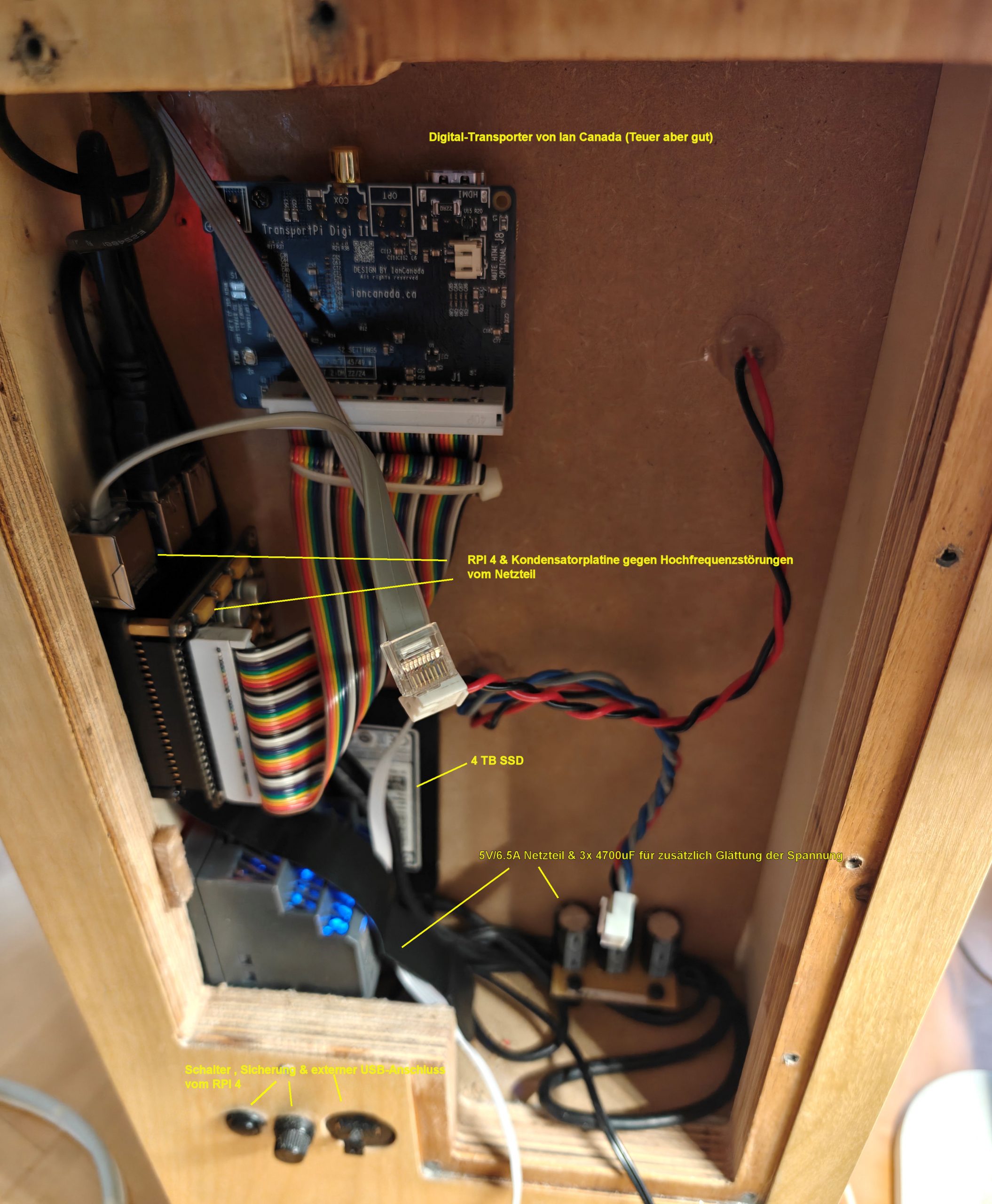 Die Digitalplatine ist intern mit dem Hypex-SPDIF-Eingang verbunden . Der Lüfter ist ein 12V Lüfter der mit 5V versorgt wird und unhörbar . Er soll für ein wenig Luftzirkulation sorgen und ist an dem noch freien USB-Ausgang des RPI angeschlossen .
