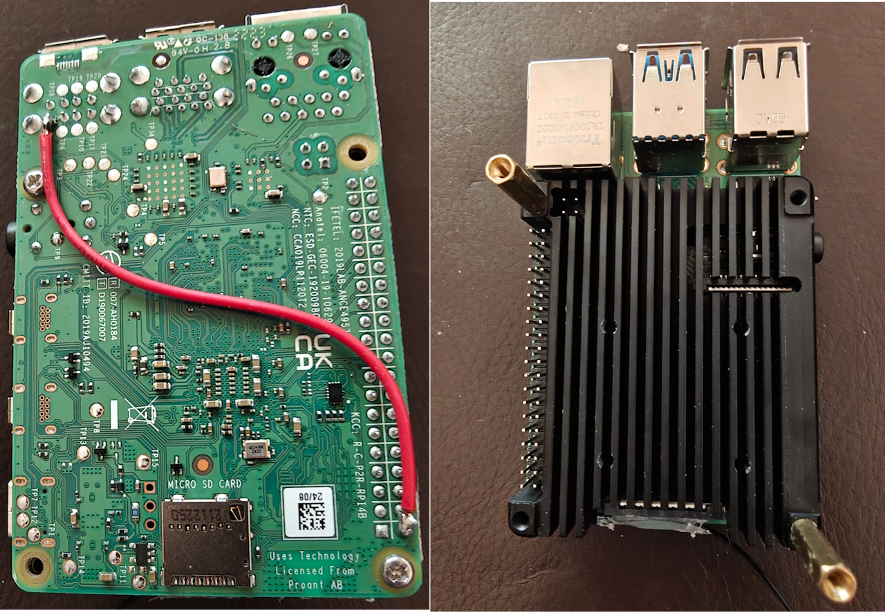 Habe noch ein Bild vom RPI angefügt . Das angelötete Kabel spart das Y-Kabel für die Spannungsversorgung von Festplatte und CD-Laufwerk . Die + Anschlüsse bei den USB-Ausgängen des RPI sind alle untereinander verbunden . Der große Kühlkörper hält die Temperatur des RPI 4 auch ohne zusätzlichen Lüfter in vertretbaren Grenzen .