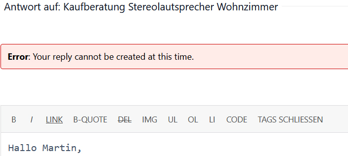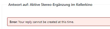 Ich erhalte im Faden Aktive Stereo-Ergänzung im Kellerkino die gleiche Fehlermeldung, wenn ich versuche zu antworten (bei mir ohne Bilder) -