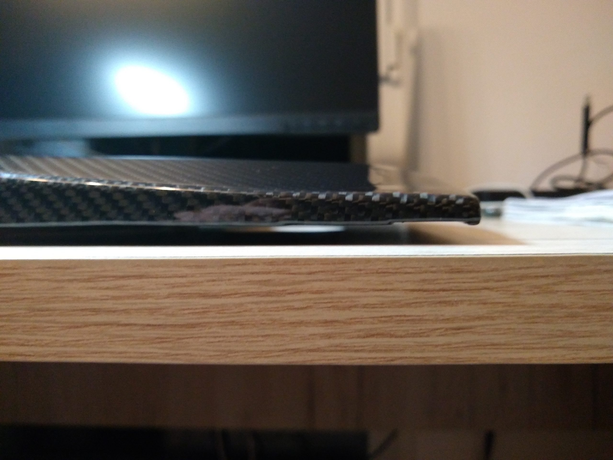 ich habe einmal eine Zeichnung gemacht, mit der ich hoffe, meine Frage anschaulicher zu machen. Ich möchte die Front aus Carbon einfassen, um den Übergang zum Gehäuse sauber zu machen. Die Einfassung ist die grüne Linie auf dem anhängenden Bild, die rund um die Front (Bleistiftstrich) geht (Die Proportionen stimmen nicht. Die Einfassung soll, wie oben geschrieben, recht unauffällig sein).
