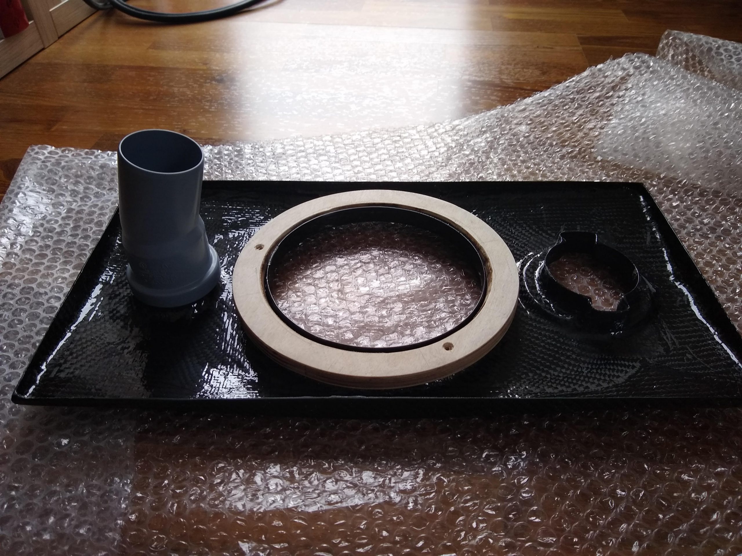 ich werkele weiterhin an meiner Front und bin mittlerweile an die Rückseite gegangen. Das BR Rohr wird mittels eines 50er Abflussrohr gestaltet, für den MT/TT habe ich einen MPX Ring gefräst, den ich einkleben/ eingießen möchte, damit er luftdicht sitzt. Dieser soll den Schrauben, die das Chassis an die Front fixieren, Halt geben. Urspünglich wollte ich um den HT eine ähnliche hölzerne Konstruktion machen. Da das Carbon hier beim Tiefziehen diverse Falten geworfen hat, ist es aber kaum möglich, das aus Holz so zu arbeiten, dass es hier vernünftig sitzt.
