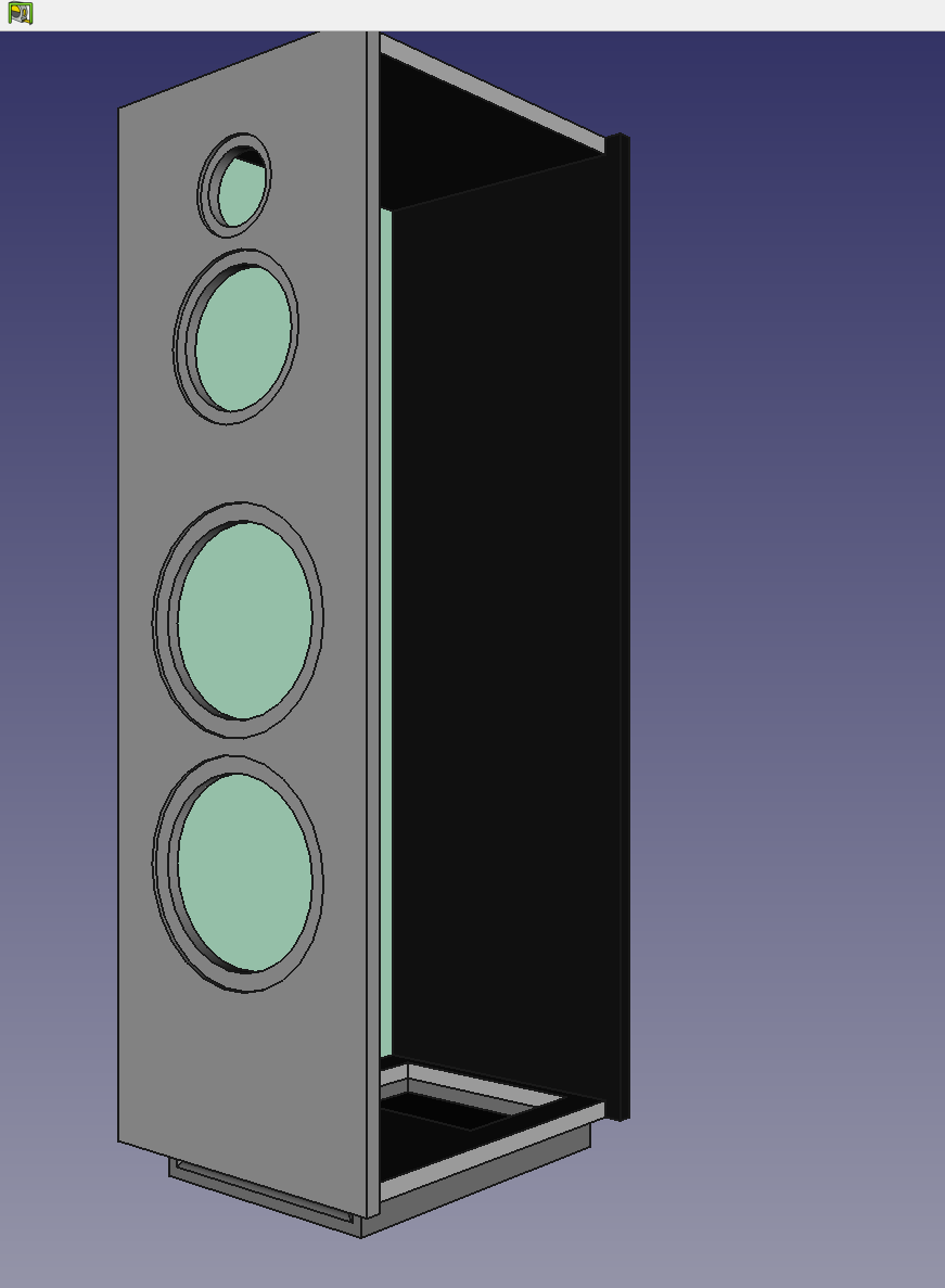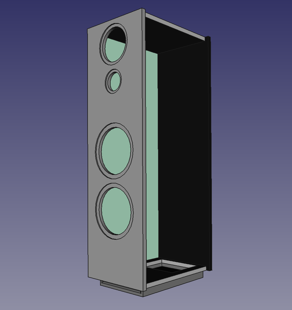 Ein bisschen Verlust bei den Versteifungen und 10% Toleranzen dann komm ich doch immer noch auf rund 100L für die beiden Tieftöner. Oder mache ich hier gerade einen Gedankenfehler?Im Moment bin ich noch am hin und her überlegen ob die 1,20m nicht doch auch einfach gut sind. Hat ja auch irgendwie was, so was hohes. Mal schauen. Mein letzter Gedankensplitter war jetzt, ähnlich wie bei einigen Canton reference den BR-Schlitz in den Fuß zu planen und den Fuß ein wenig zurückspringen zu lassen. Mal gucken..ich muss das mal irgendwie in 3D bringen…