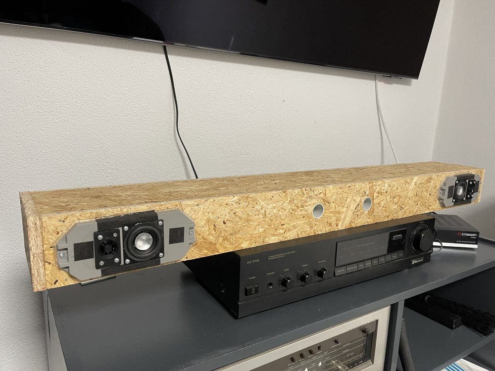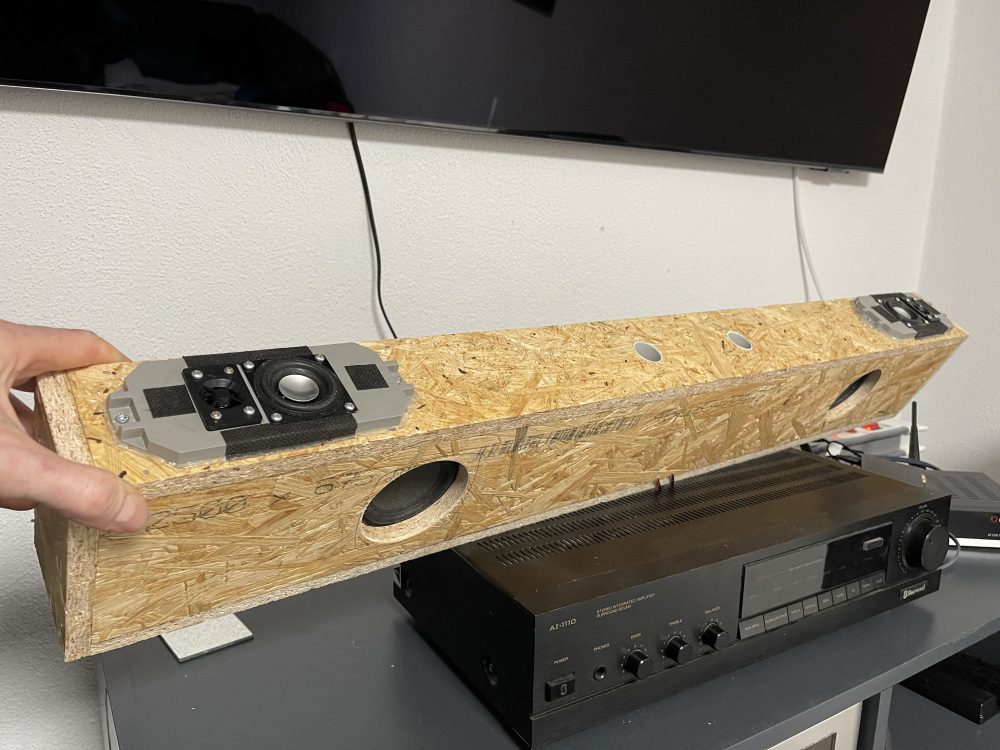 Eine erste Studie mit einem Satz Lautsprecher aus einem GRUNDIG Lenaro Fernseher getrieben von einem alten Sherwood-Verstärker klingt vielversprechend – siehe Fotos.
