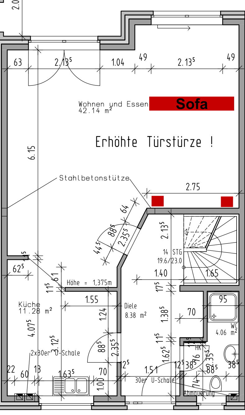 - Im Anhang findet ihr einen Grundriss sowie ein Bild der Situation -> Die Lautsprecher sollen jeweils neben dem TV positioniert werden (rote Kästchen), ca. 3,5m vom Sofa entfernt